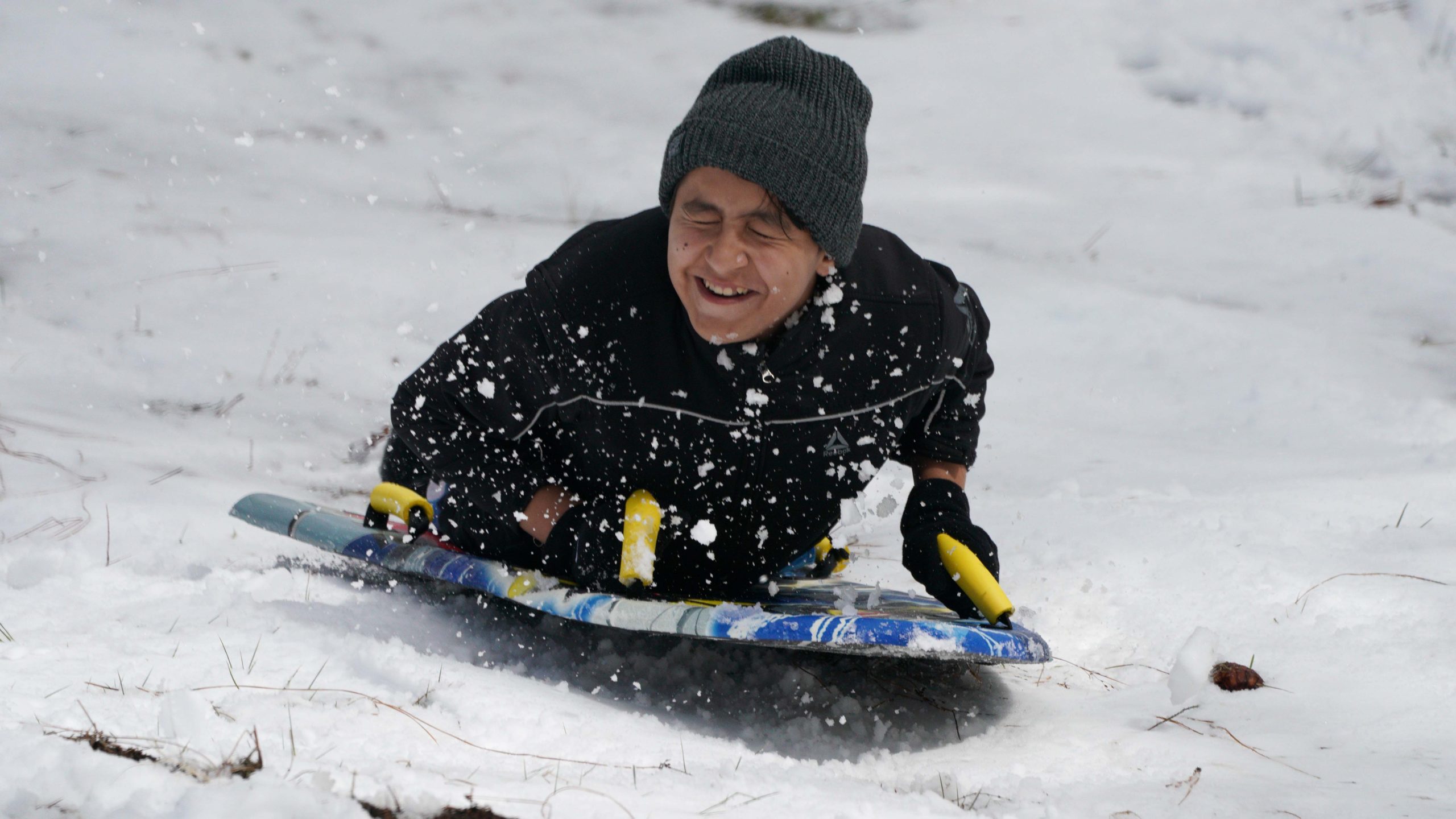 Cameron Rollin, 19, of Jamul and four friends fashioned a mini-jump from stray logs and packed snow to launch their circular sleds. Their flying saucers landed safely — chased by two dogs they brought with them.