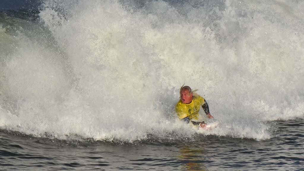 Saturday’s four-person heats also began at 7 a.m. — contested while recreational OB surfers sharing the same waves. They include both genders, and junior and masters divisions, with two 61-year-old men competing, including Tony Prince, a bodyboarding legend and sports photographer.